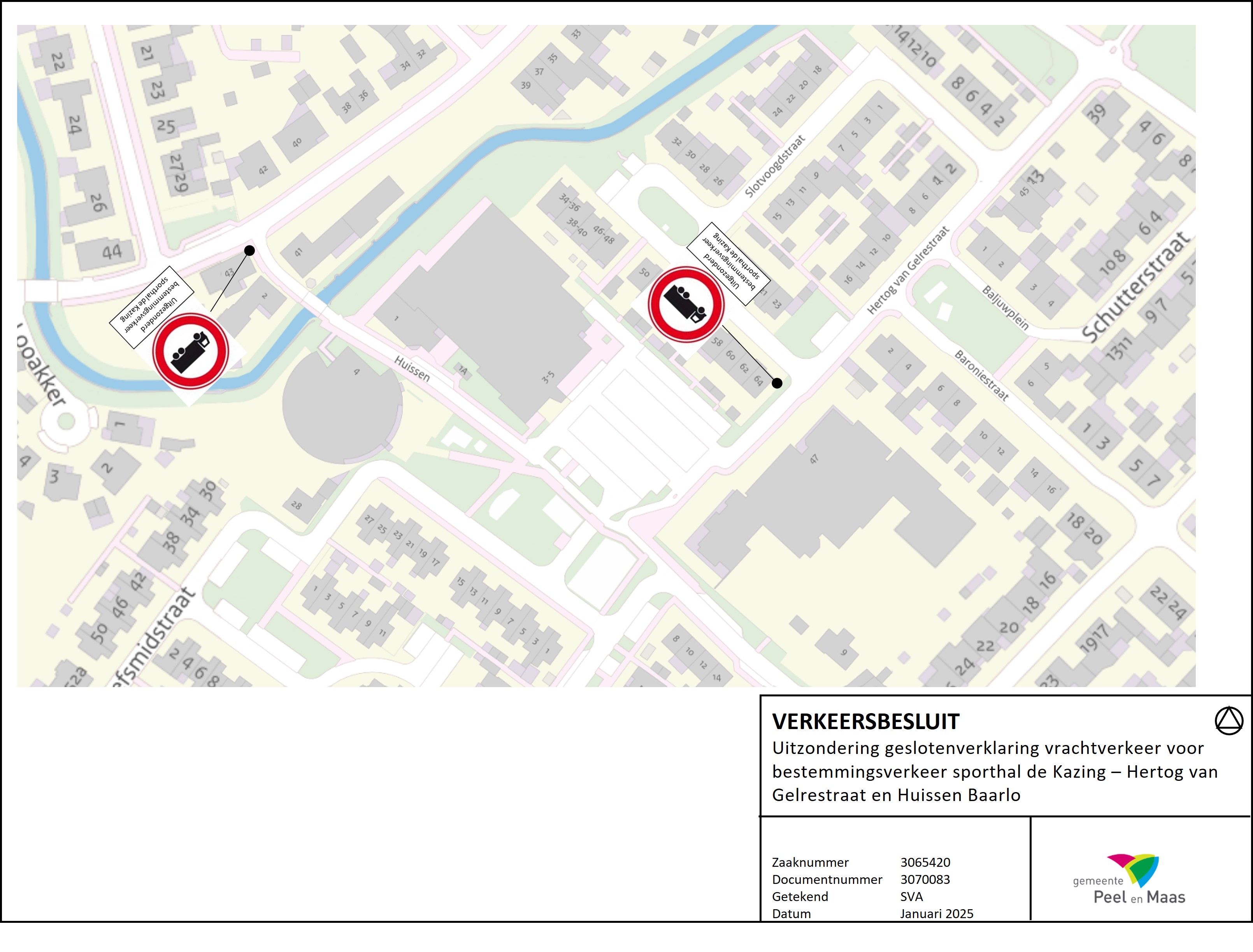 Door het bevestigen van een onderbord met tekstopschrift “Uitgezonderd bestemmingsverkeer sporthal de Kazing” onder het bestaande verkeersbord C7 van Bijlage van het RVV 1990, bestemmingsverkeer van sporthal de Kazing uit te zonderen van de bestaande gesloten verklaring voor vrachtverkeer op de Hertog van Gelrestraat en Huissen te Baarlo;