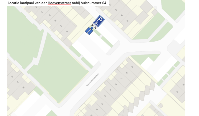 door middel van het plaatsen van verkeersbord E8c van bijlage 1 van het RVV1990 met onderbord OB504, pijlen – schuin (links/rechts) wijzend, waaruit blijkt dat het bord voor twee parkeerplaatsen te reserveren voor het opladen van elektrische voertuigen op de van der Hoevensstraat nabij huisnummer 64.