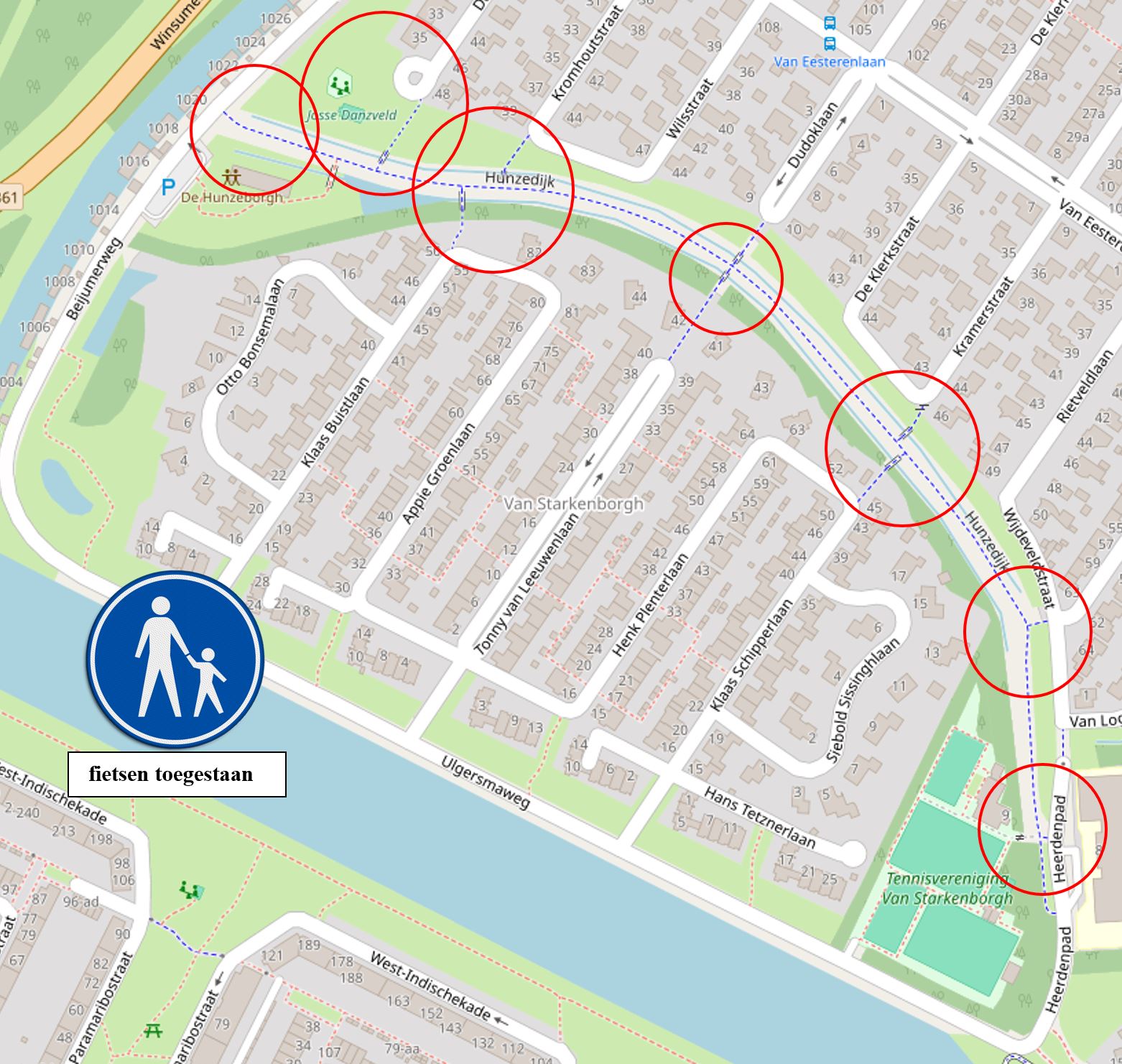 De Hunzedijk wordt nu aangeduid als ‘onverplicht fietspad’. Dagelijks maken zowel fietsers als voetgangers gebruik van dit fietspad. Vanuit de wijkvereniging is de wens ontstaan om dit fietspad om te zetten naar een voetpad met onderbord met daarop de tekst “fietsen toegestaan”. De Hunzedijk is namelijk ook een loosloopgebied voor honden.
