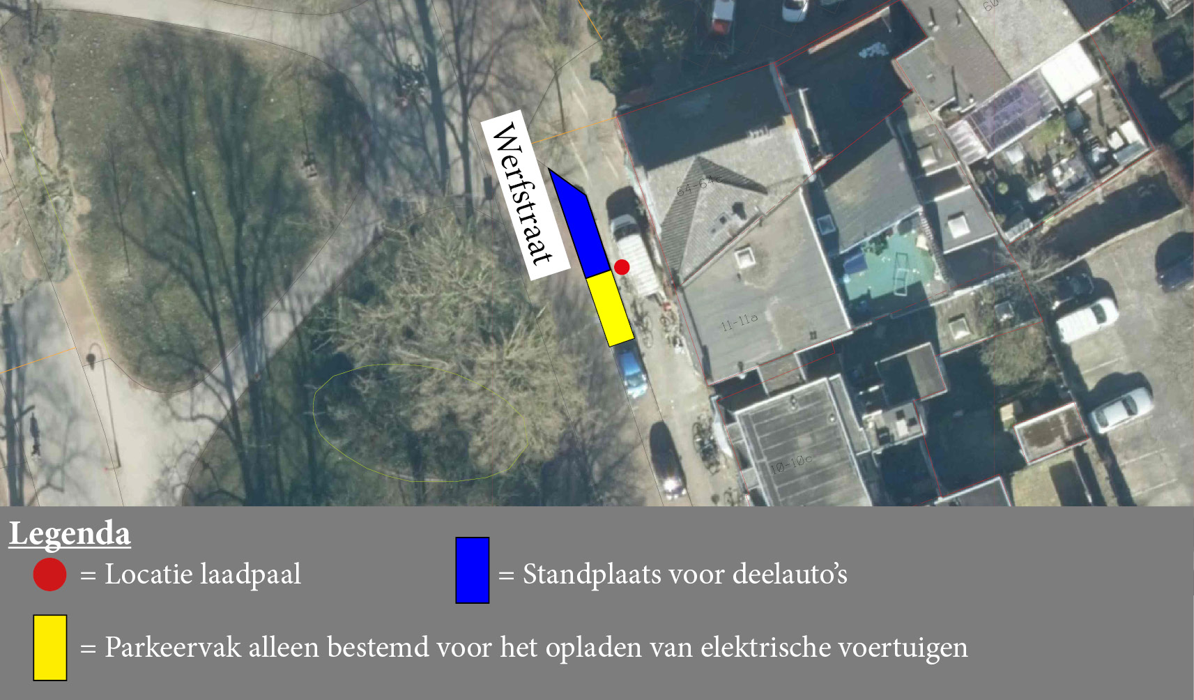 Er is een aanvraag ingediend om een standplaats voor (elektrische) deelauto’s in te richten bij een bestaande laadlocatie aan de Werfstraat ter plaatse van nummer 11. In een eerder stadium is voor de bijbehorende parkeervakken bij deze laadlocatie een verkeersbesluit genomen om de vakken aan te wijzen als parkeervakken alleen voor opladen elektrische voertuigen. De gemeente Groningen beoordeelt een ingekomen aanvraag op basis van het document ‘Afwegingscriteria Openbare Laadinfrastructuur’ (terug te vinden op de gemeentelijke website), welke een uitwerking is van de ‘Visie Openbare Laadinfrastructuur Groningen 2025’.