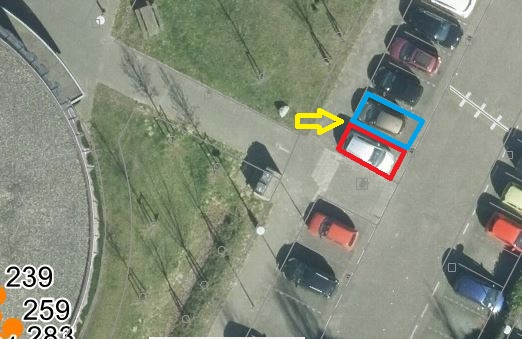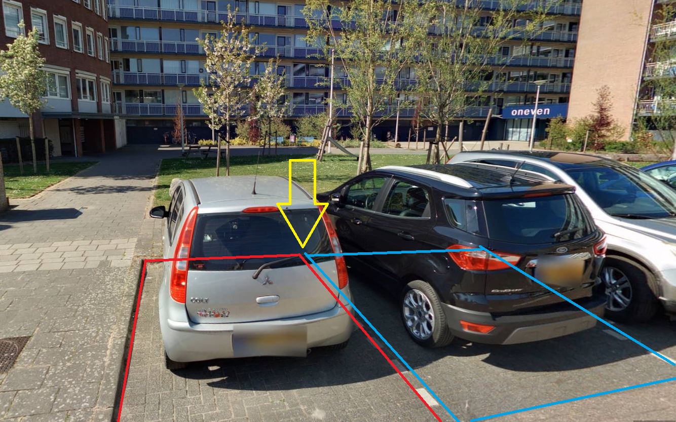 Blauwe markering= Besluit punt 2: In de toekomst mogelijk te realiseren extra parkeervak voor opladen elektrische voertuigen. Geel=aangewezen locatie voor oplaadpaal bord E8c met onderbord)
