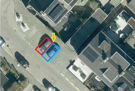 Blauwe markering= Besluit punt 2: In de toekomst mogelijk te realiseren extra parkeervak voor opladen elektrische voertuigen.