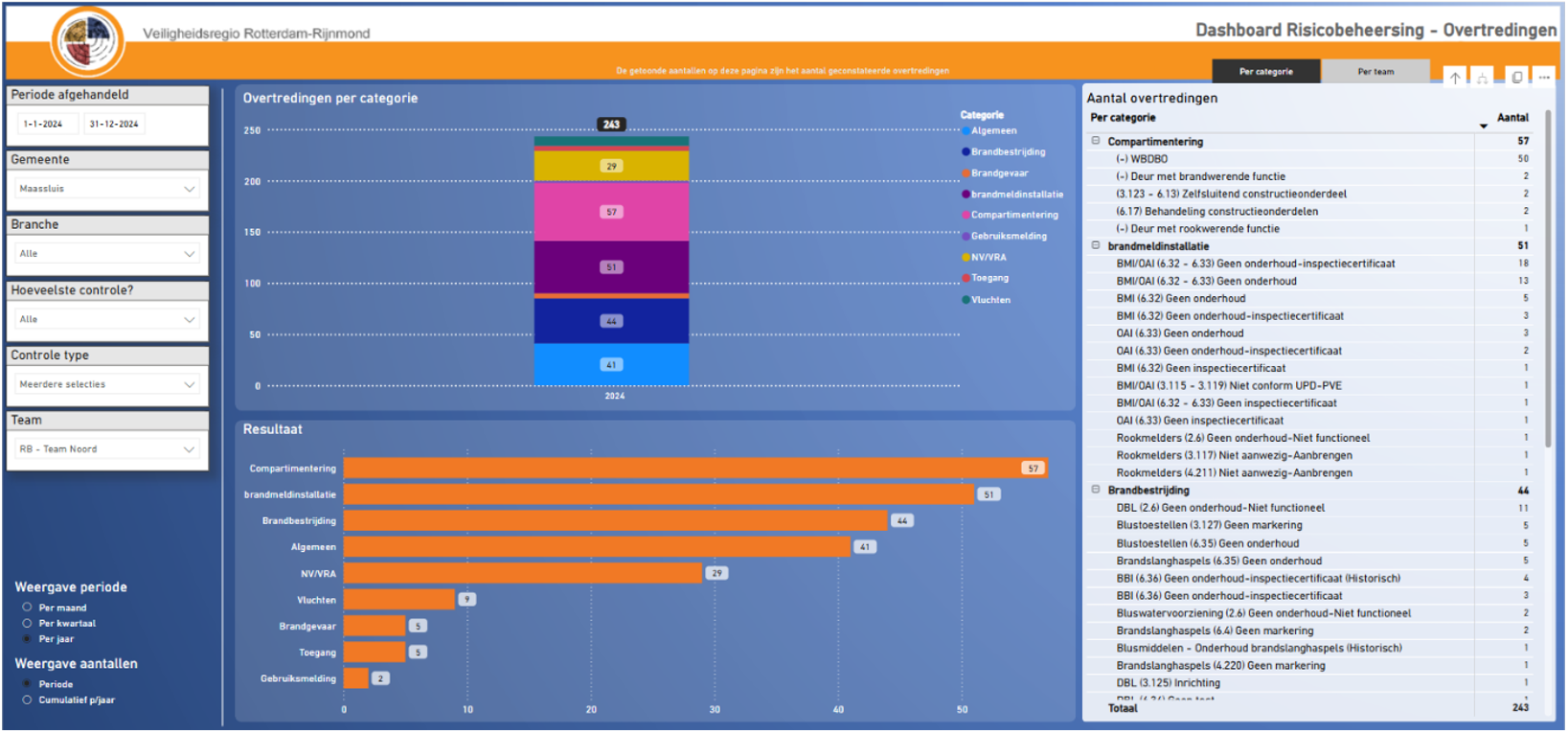 Onderstaande overzichten laten op transparante wijze zien welke resultaten in het jaar 2024 zijn behaald. Middels figuur 1 wordt inzichtelijk gemaakt hoeveel controles er in z’n totaliteit in de gemeente Maassluis zijn uitgevoerd door de afdeling brandpreventie Team Noord. Figuur 2 maakt inzichtelijk welke overtredingen er veelal door de toezichthouders worden waargenomen.