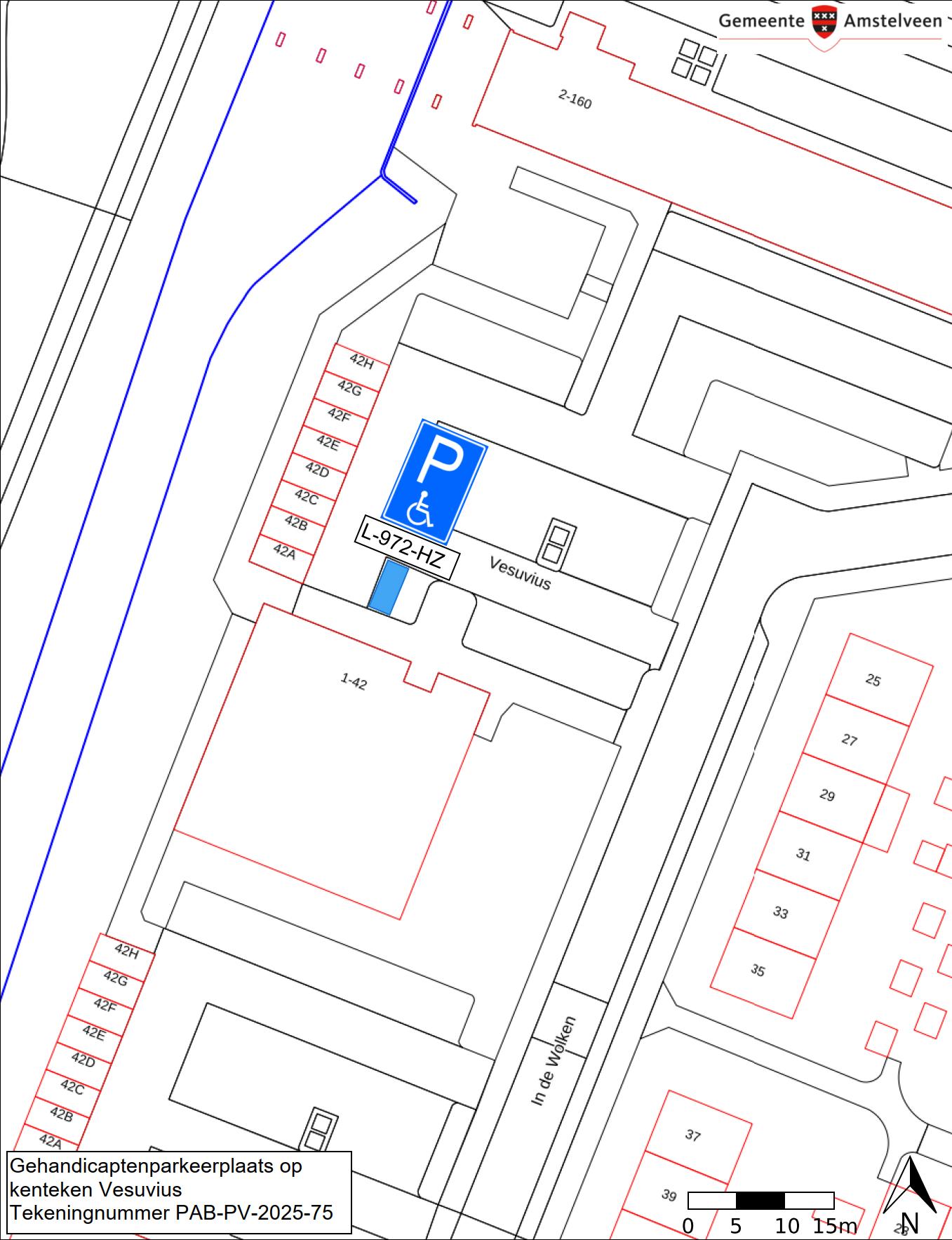 Burgemeester en wethouders van Amstelveen besluiten het parkeren te verbieden op een parkeerplaats in de straat Vesuvius, zoals aangegeven op tekening PAB-PV-2025-75, met uitzondering van het voertuig met het kenteken L-972-HZ (gehandicaptenparkeerplaats).