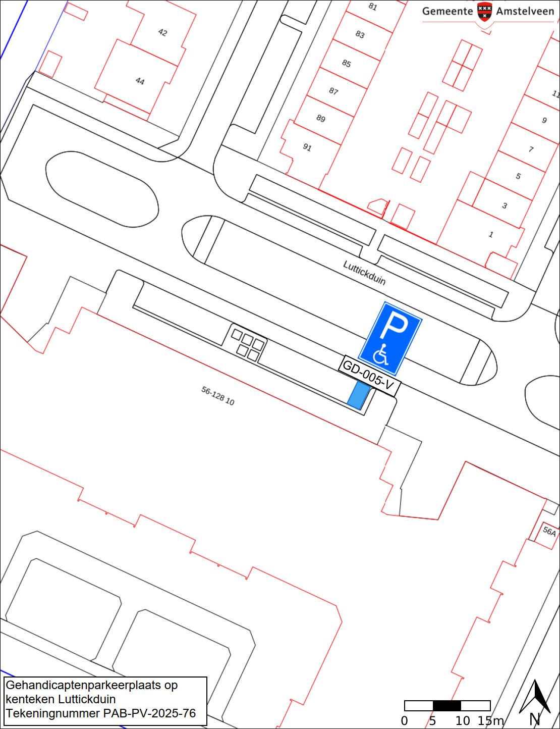Burgemeester en wethouders van Amstelveen besluiten het parkeren te verbieden op een parkeerplaats in de straat Luttickduin, zoals aangegeven op tekening PAB-PV-2025-76, met uitzondering van het voertuig met het kenteken GD-005-V (gehandicaptenparkeerplaats).