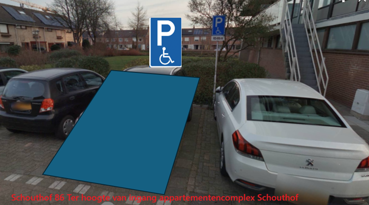 Een parkeerplaats aan de Schouthof ter hoogte van nummer 86 in te stellen als een individuele gehandicaptenparkeerplaats, door het plaatsen van bord model E6 van Bijlage 1 van het RVV 1990, voorzien van een onderbord met daarop aangegeven het kenteken van het voertuig van de aanvrager (HS-500-K) en het markeren van het betreffende vak;