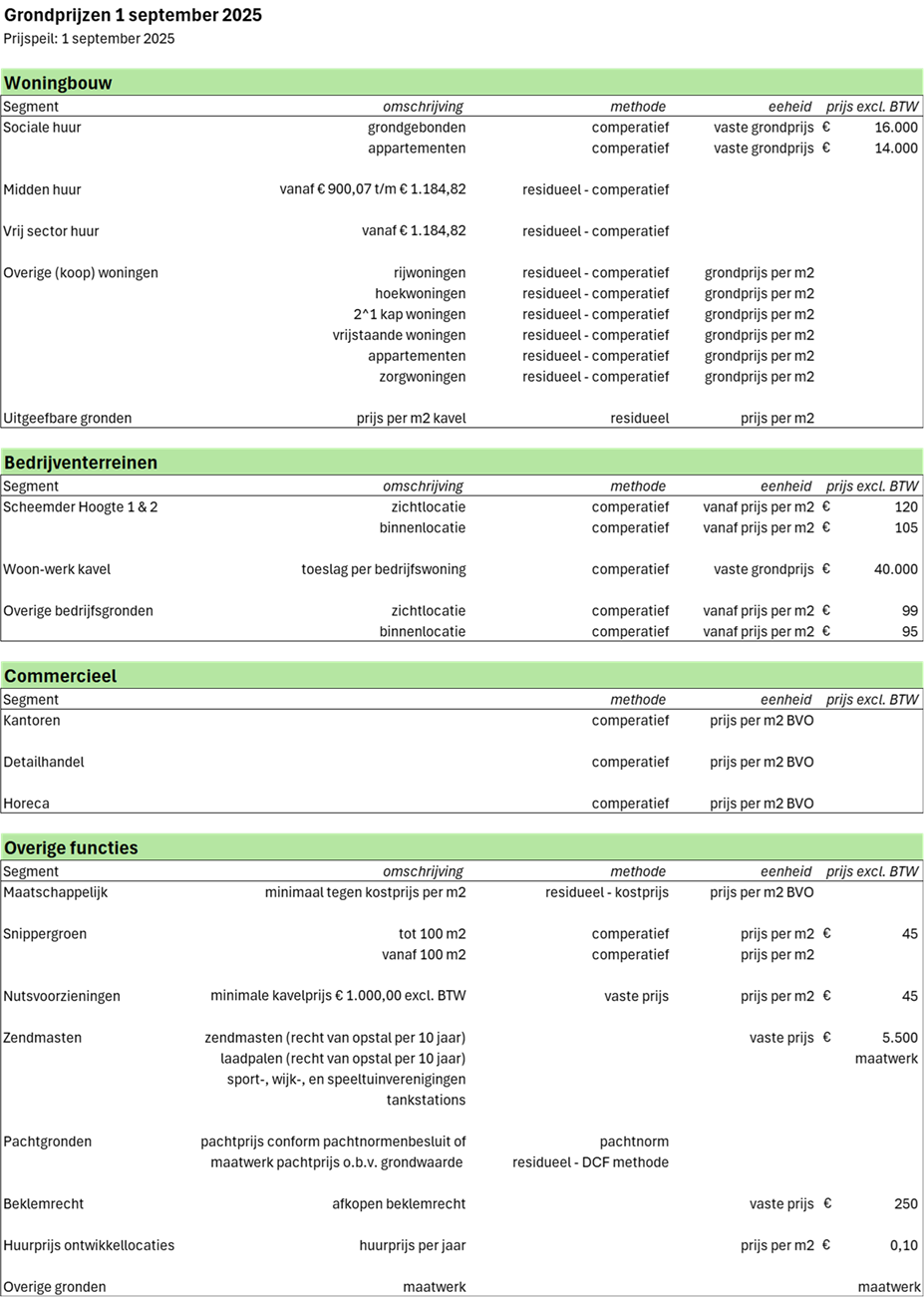 De geldende grondprijzen worden beschreven voor de woningbouwkavels, bedrijventerreinen en overige gronden.