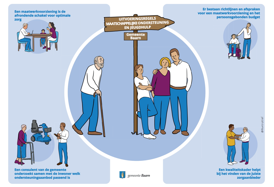 De gemeente Baarn wil inwoners goed helpen via de Wmo en Jeugdwet. Dat betekent dat we niet alleen kijken naar wat iemand vraagt, maar ook naar andere problemen die er misschien zijn. Bijvoorbeeld eenzaamheid bij ouderen of problemen van ouders die het lastig vinden om met het gedrag van hun kind om te gaan. Om de juiste hulp te kunnen bieden, willen we graag verder kijken dan de vraag die u stelt. Daarom komen we soms bij u op huisbezoek om te zien wat er speelt. Waar het kan, maken we gebruik van voorzieningen die er voor iedereen zijn.