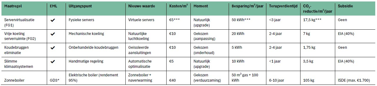 - Maatregelen zonder EML-code zijn niet opgenomen in de officiële lijst vanwege langere terugverdientijd of beperkte toepasbaarheid (zoals batterijen, warmtepomp met WKO);