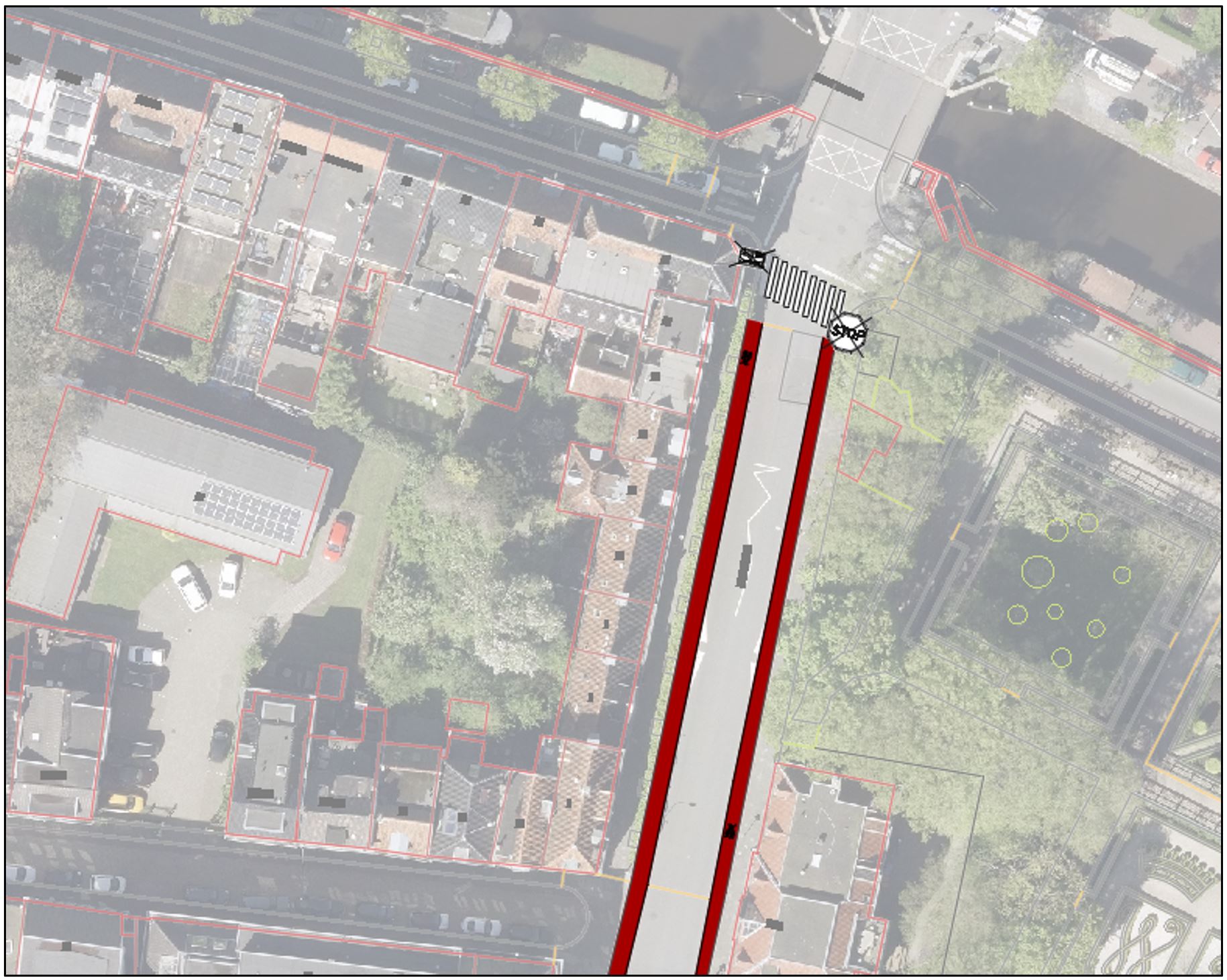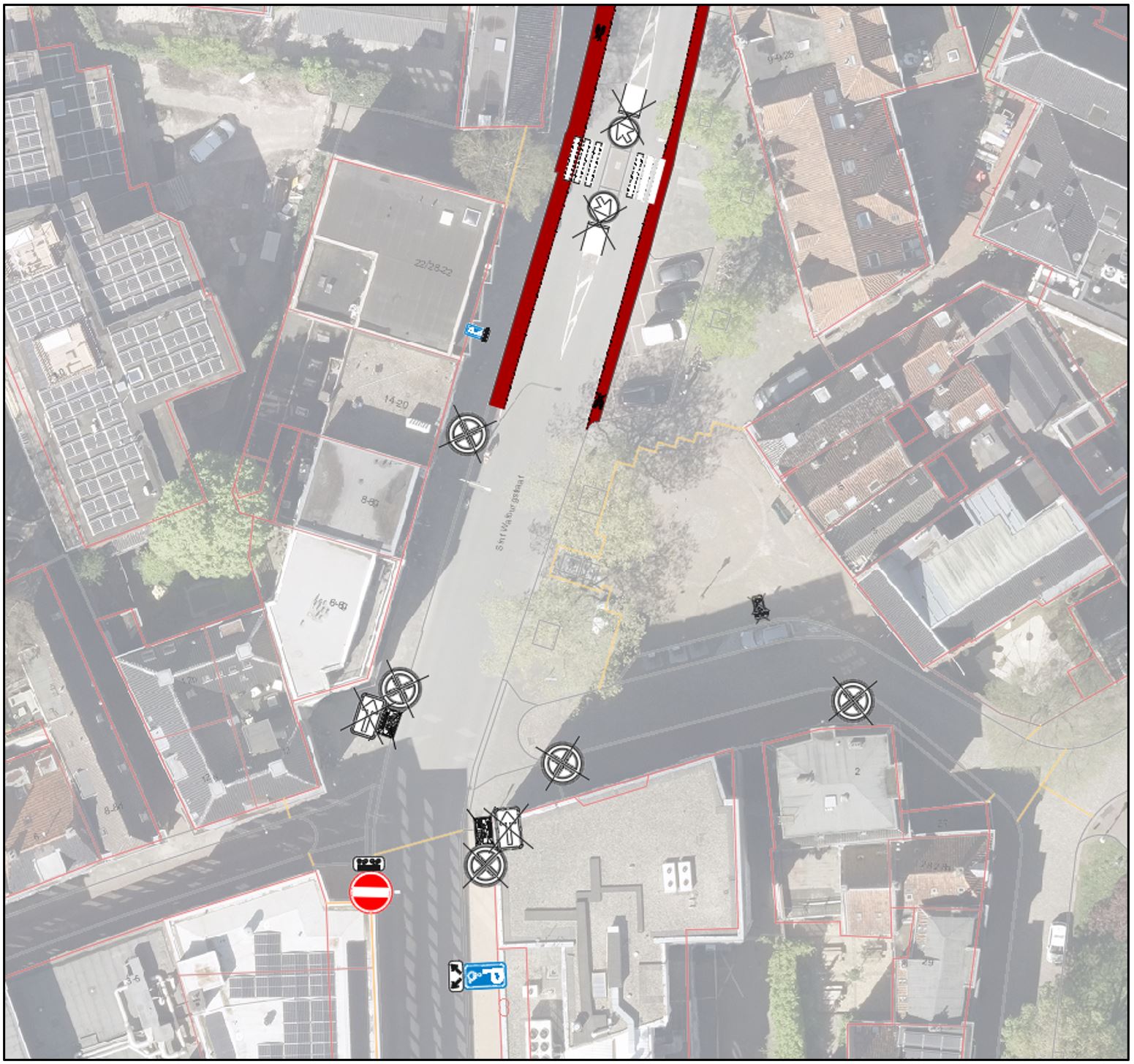 De straat wordt ingericht als herkenbaar 30 km/u gebied waar lopen en fietsen meer centraal staat waardoor oversteken overal mogelijk is, en aparte geregelde oversteken niet meer nodig zijn. Daarom worden er 5 voetgangersoversteken bij de herinrichting opgeheven.