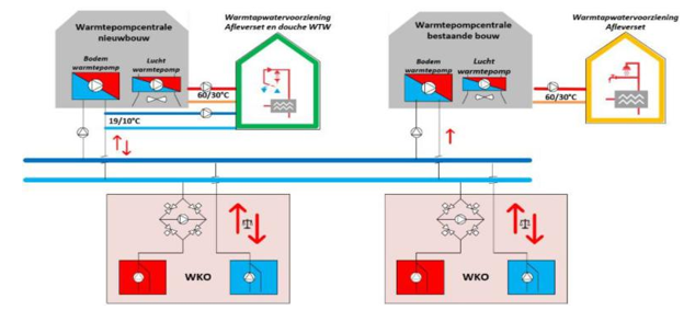 Onderstaande figuur schetst voor nieuwbouw en grootschalige renovatie bestaande bouw het warmte-koude-net.