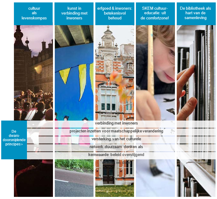 Onze strategische aanpak is thematisch en bestaat uit vijf culturele kernthema’s, ondersteund door vijf richtinggevende, dwarsdoorsnijdende principes die als rode draad door ons beleid en uitvoeringsprogramma lopen en de integratie van essentiële waarden waarborgen. Elk kernthema is gekoppeld aan meetbare doelstellingen en evaluatiemechanismen. Deze aanpak zorgt voor een dynamische cultuurvisie die concrete doelen stelt, maar ook flexibele richtlijnen biedt om in te spelen op de veranderende sociale, culturele en maatschappelijke context.