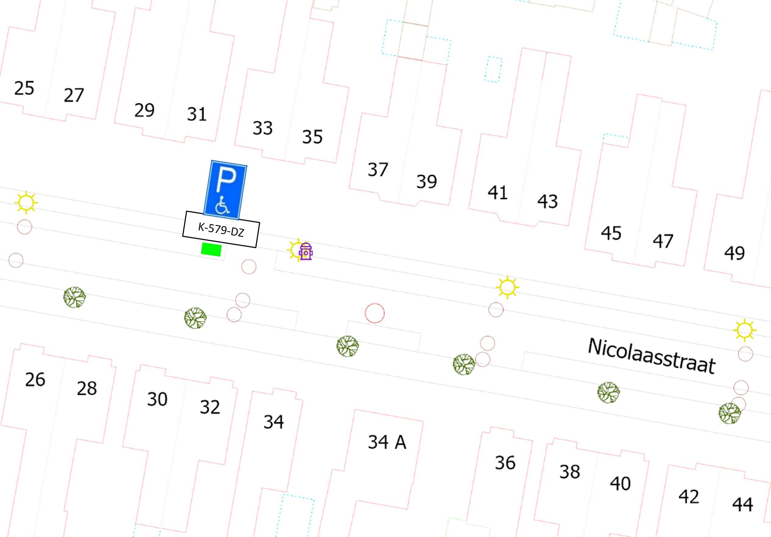 Het aanwijzen en inrichten van een gehandicaptenparkeerplaats op kenteken aan de Nicolaasstraat, ter hoogte van perceelnummer 31, door het plaatsen van het verkeersbord E6 van het RVV 1990 met onderbord met kenteken K-579-DZ, zoals is aangegeven op de overzichtstekening in dit besluit.