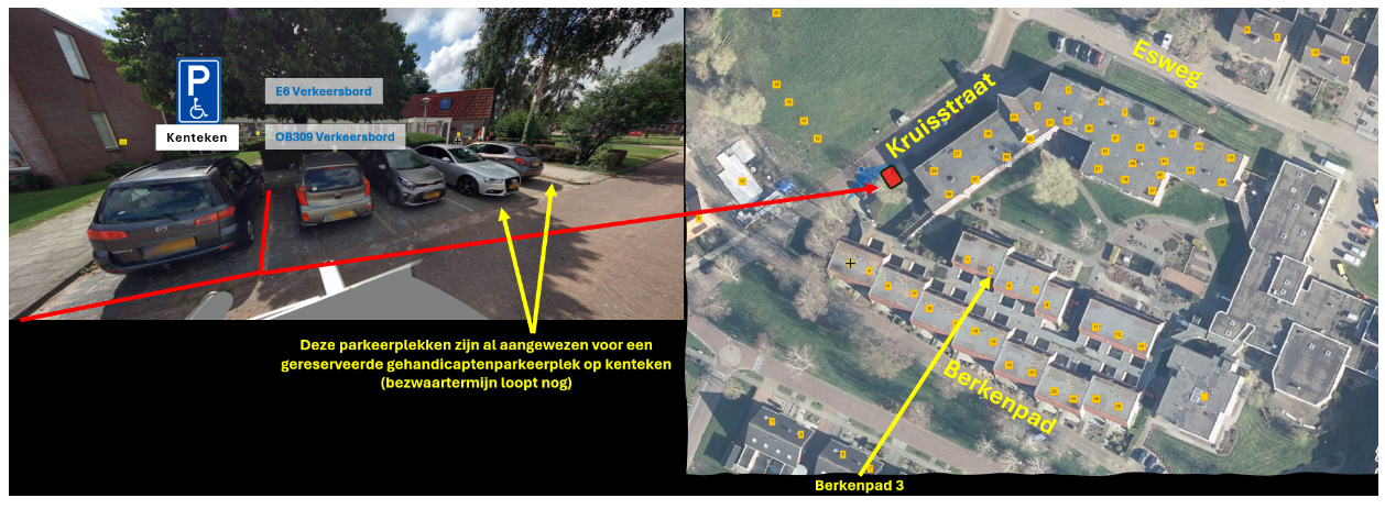 dat op dit moment er twee verkeersbesluiten ter inzage liggen voor het realiseren van een gereserveerde gehandicaptenparkeerplaats op kenteken (betreffende de meest rechtse parkeerplaats en de parkeerplaats direct daarnaast). De meest rechtse parkeerplek is 3,0 meter breed en daardoor beter geschikt, maar op dit moment niet beschikbaar;