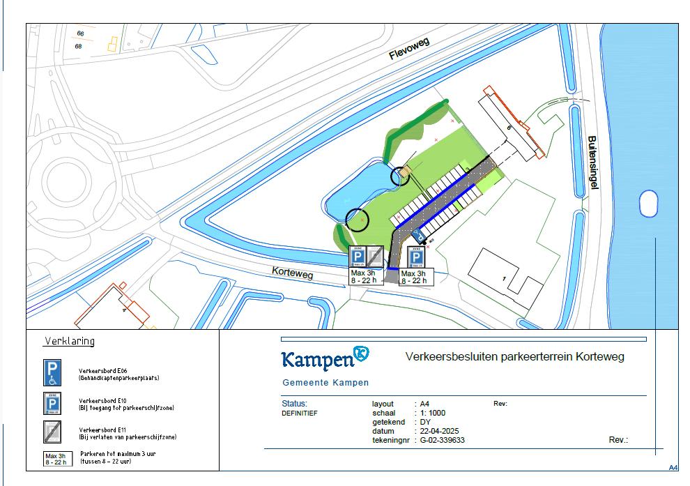 - door middel van het plaatsen van de verkeersborden E10 en E11 van bijlage 1 van het RVV 1990 met onderborden met de tekst ‘8:00 – 22:00 h maandag t/m zaterdag’ en het aanbrengen van een blauwe streep zoals bedoeld in artikel 25 lid 2 van het RVV 1990 op het parkeerterrein bij de Korteweg, alle parkeerplaatsen aan te wijzen als onderdeel van een parkeerschijfzone;