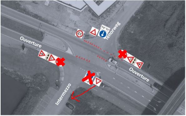 7: Verkeersbord B6 ter hoogte van het kruispunt Ouverture met de Intermezzo dient te worden verplaatst naar de met de rode pijl aangegeven locatie.