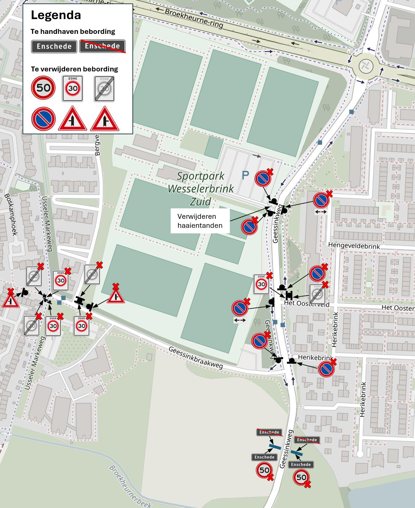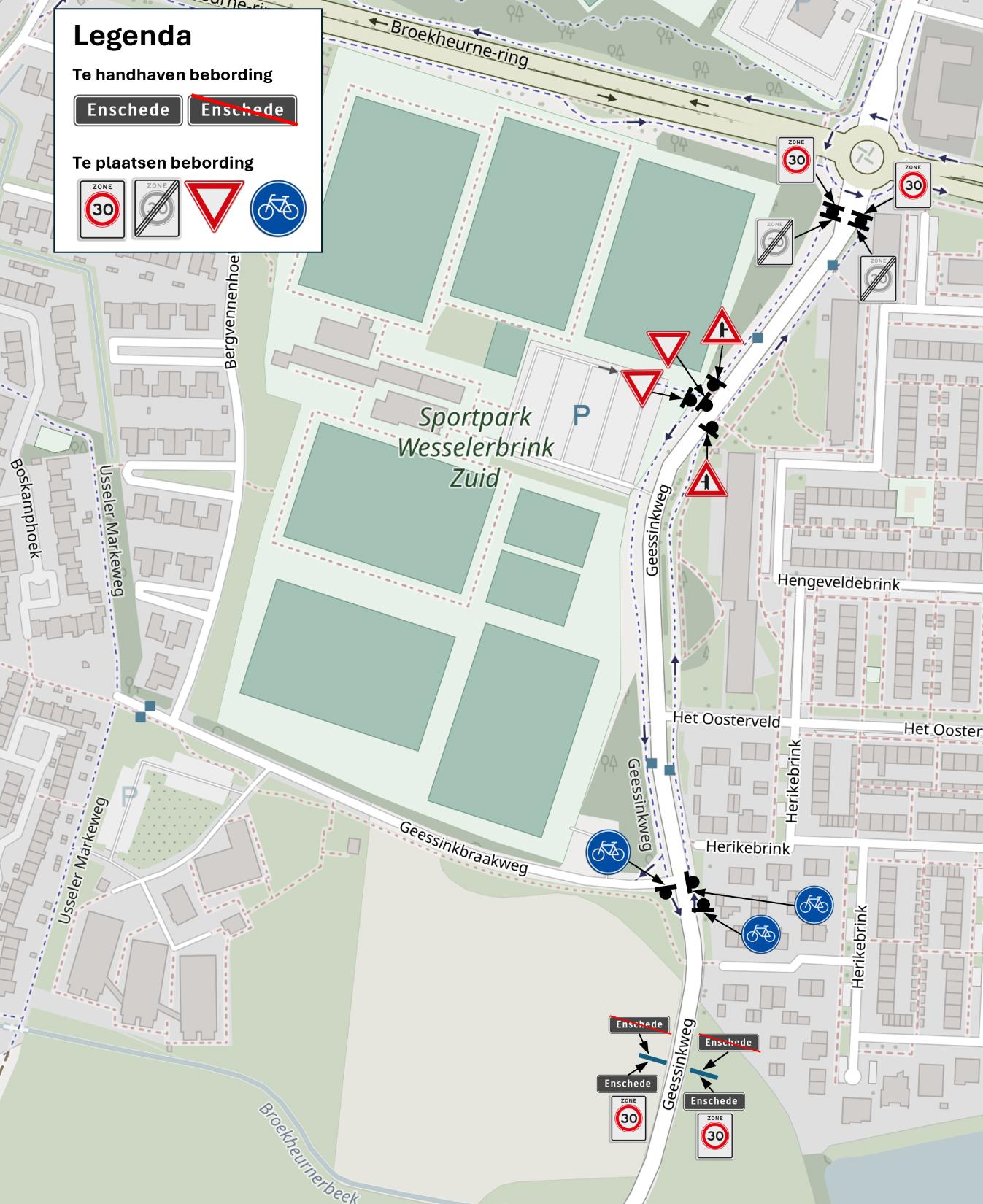 dat het instellen van de 30 km/u zone wordt gerealiseerd door het plaatsen van borden begin/einde zone A1-30 van bijlage 1 van het RVV 1990 op de Geessinkweg, ter hoogte van de Broekheurne-Ring en Geessinkbraakweg, en door het verwijderen van deze borden op Het Oosterveld;