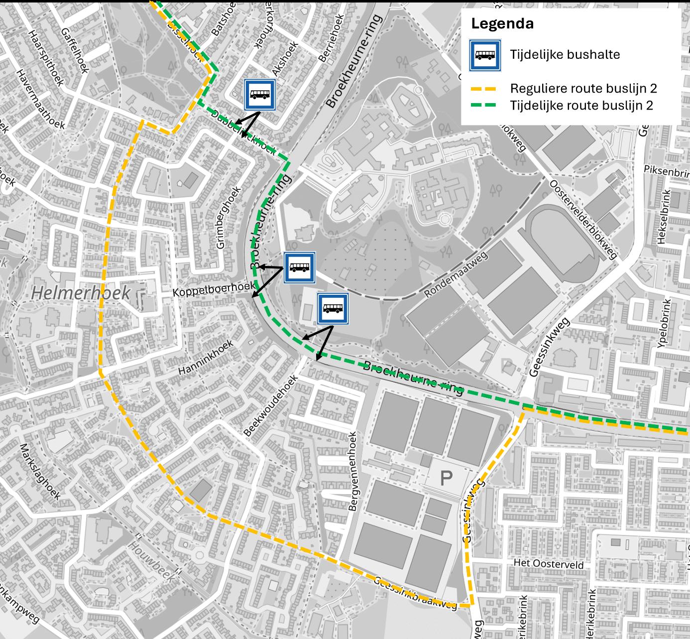 dat deze tijdelijke alternatieve route inhoudt dat buslijn 2 tijdelijk geen gebruik maakt van de reguliere route, namelijk via de Geessinkweg - Geessinkbraakweg – Busbaan Helmerbroek – Haarspithoek – Dubbelinckhoek;