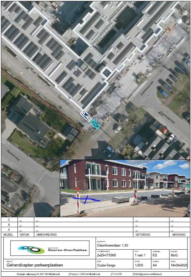 tot het aanwijzen van een gehandicaptenparkeerplaats op kenteken in de Eisenhowerlaan, in de haakse parkeervakken tegenover de woning met huisnummer 1.30 te Oude-Tonge, door het plaatsen van verkeersbord E06 met onderbord OB309 met daarop het kenteken van de aanvrager conform model van bijlage I van het Reglement Verkeersregels en Verkeerstekens 1990;
