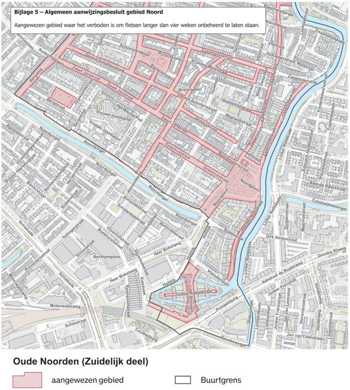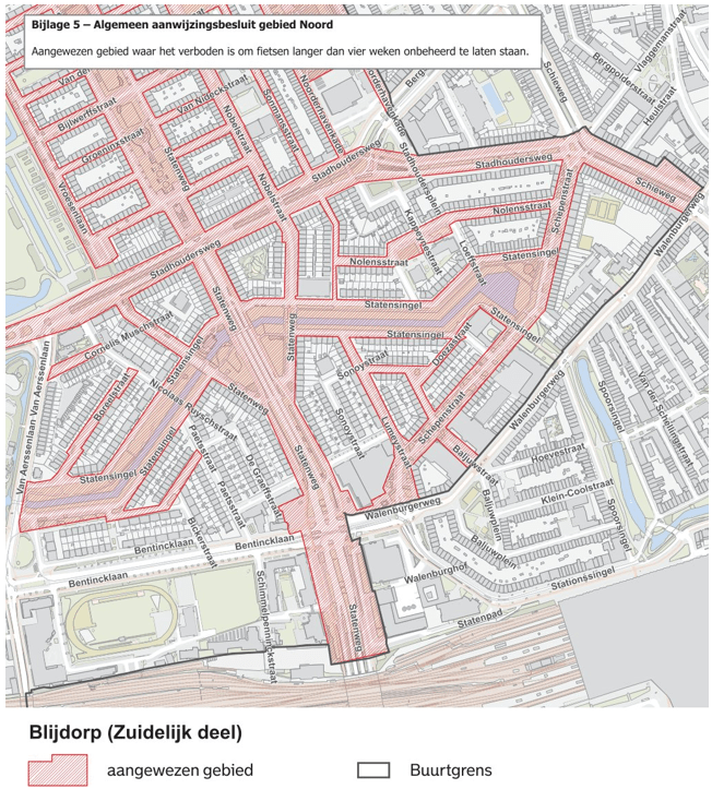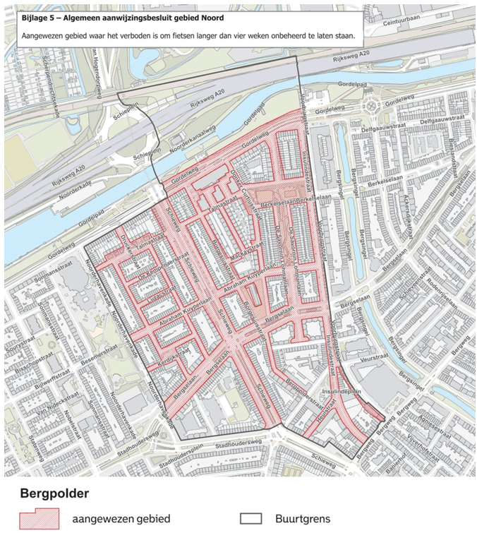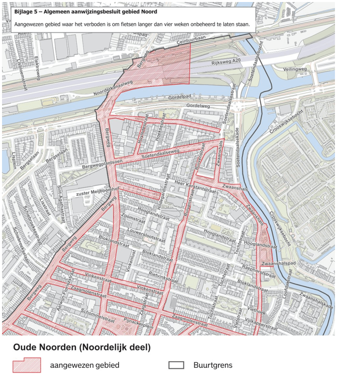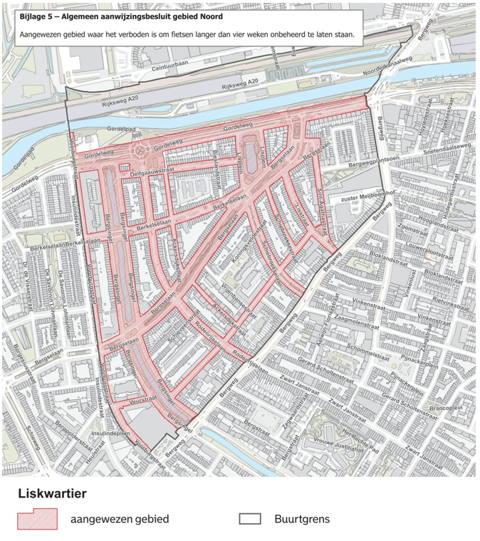 Op grond van artikel 5:12, eerste lid, onderdeel b, van de APV Rotterdam 2012 worden als wegen of weggedeelten waar het verboden is in het belang van het uiterlijk aanzien van de gemeente, ter voorkoming of opheffing van overlast, dan wel ter voorkoming van schade aan de volksgezondheid fietsen of bromfietsen langer dan vier weken onbeheerd te laten staan, de wegen en weggedeelten, zoals weergegeven op de kaarten in bijlage 5.