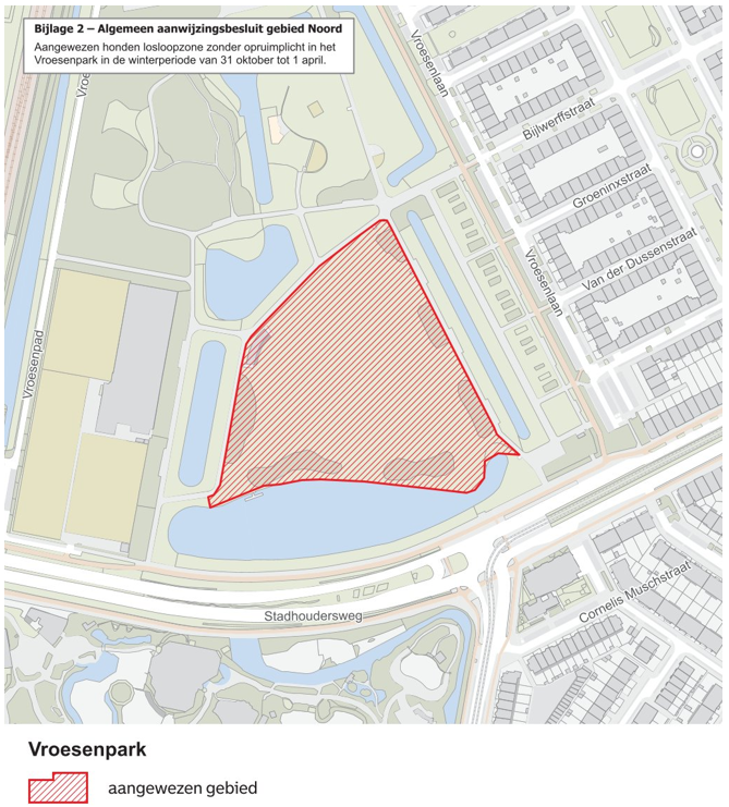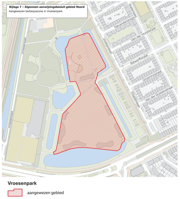 Op grond van artikel 5:34, vijfde lid, van de APV Rotterdam 2012, wordt als gebied waar het verboden is vuur te stoken voor koken, bakken en braden, het gehele Vroesenpark aangewezen, met uitzondering van het in bijlage 7 aangeduide gebied