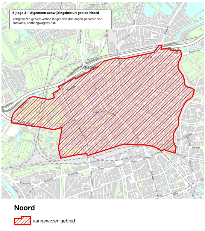 Op grond van artikel 5:6, eerste lid, onderdeel b, van de APV Rotterdam 2012, worden als wegen of weggedeelten waar het met het oog op de verdeling van beschikbare parkeerruimte verboden is een woonwagen, kampeerwagen, camper, caravan, magazijnwagen, aanhangwagen, keetwagen of ander dergelijk voertuig dat uitsluitend of mede voor andere dan verkeersdoeleinden wordt gebruikt, langer dan op drie achtereenvolgende dagen te parkeren, aangewezen de in bijlage 3 aangeduide wegen of weggedeelten.
