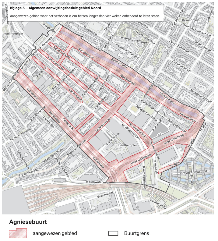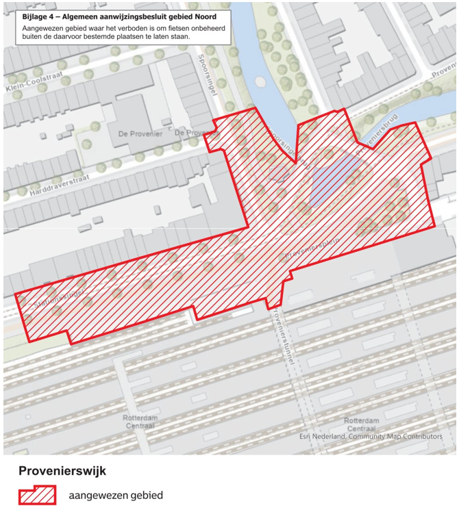 Op grond van artikel 5:12, eerste lid, onderdeel a, van de APV Rotterdam 2012 worden als wegen of weggedeelten waar het in het belang van het uiterlijk aanzien van de gemeente, ter voorkoming of opheffing van overlast, dan wel ter voorkoming van schade aan de volksgezondheid verboden is fietsen of bromfietsen onbeheerd buiten de daarvoor bestemde ruimten of plaatsen te laten staan aangewezen de wegen en weggedeelten weergegeven op de kaart in bijlage 4.