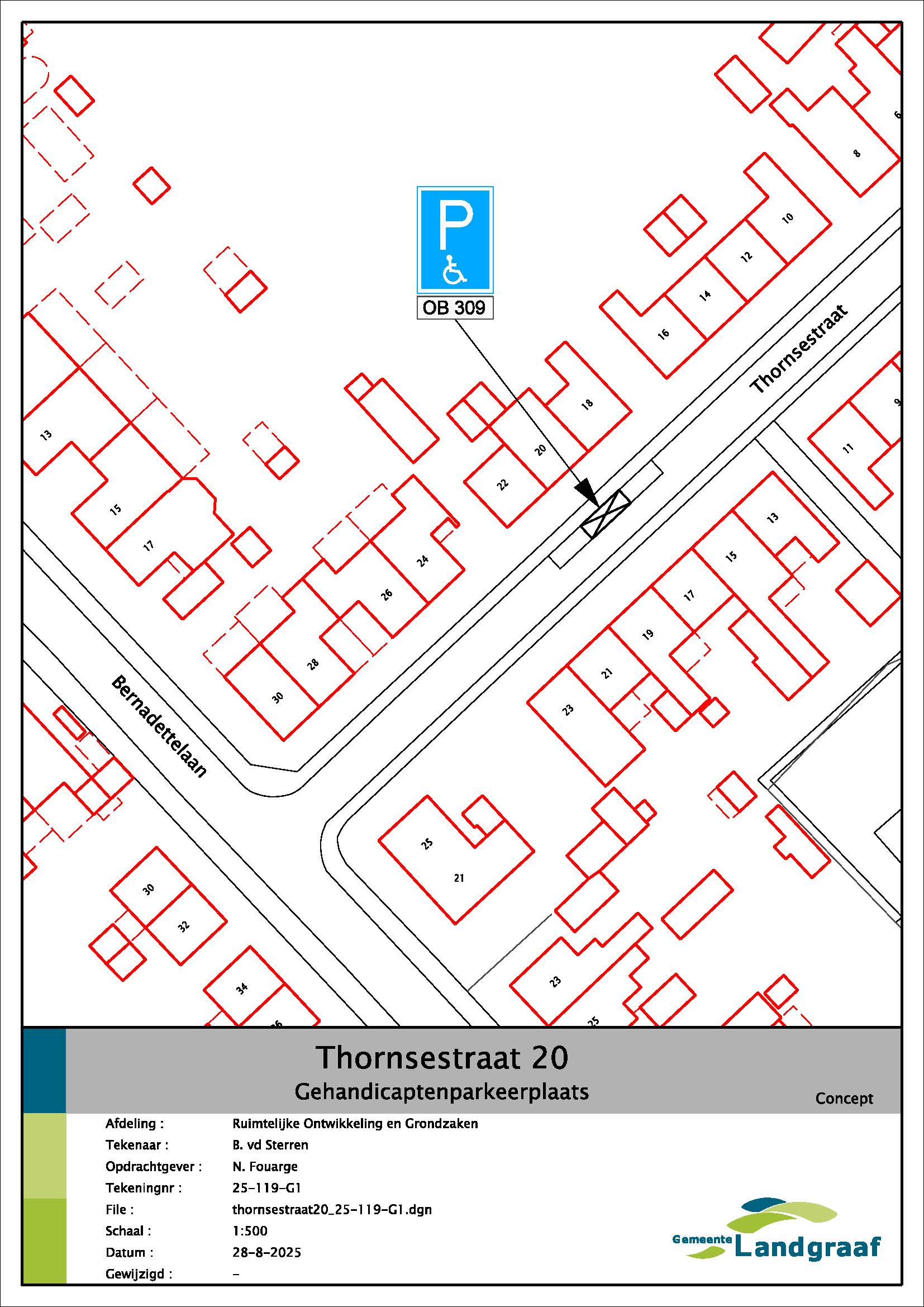 De gemeente heeft een verzoek ontvangen voor het aanwijzen en inrichten van een gehandicaptenparkeerplaats op kenteken nabij de Thornsestraat 20.