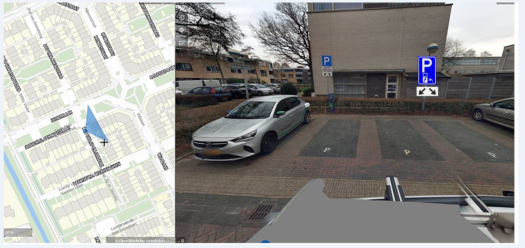 In de afbeelding hierboven staat links met een blauwe driehoek aangegeven waar de laadpaal gaat komen. Rechts kunt u zien welke twee extra parkeervakken gereserveerd worden.