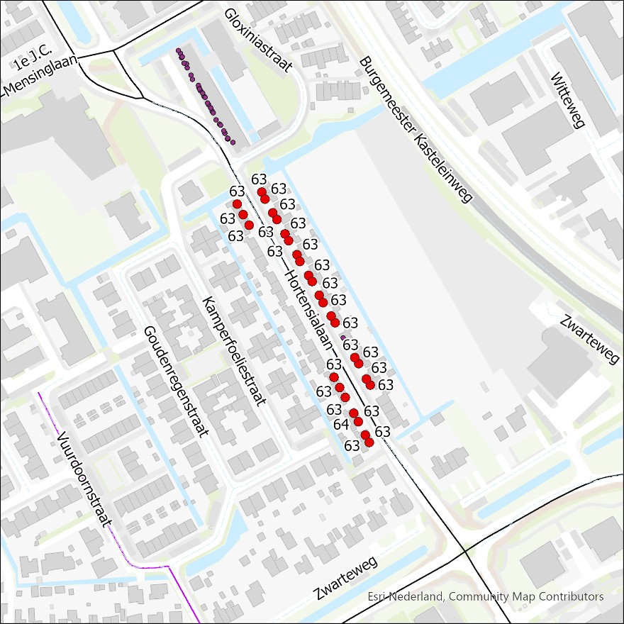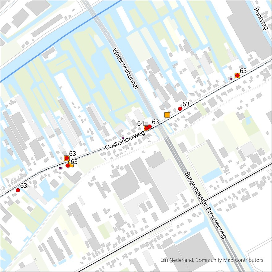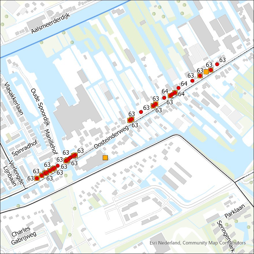 Bij 28 adressen aan de Oosteinderweg is het geluid 63 – 64 dB, hier heeft sanering plaatsgevonden. Bij de woningen wordt voldaan aan max. binnenwaarde (zie Figuur 5 7 ). Aan de oostzijde van de Oosteinderweg liggen nog 7 adressen met geluid van 63 – 64 dB, ook hier heeft veelal al sanering plaatsgevonden (Figuur 5 8).
