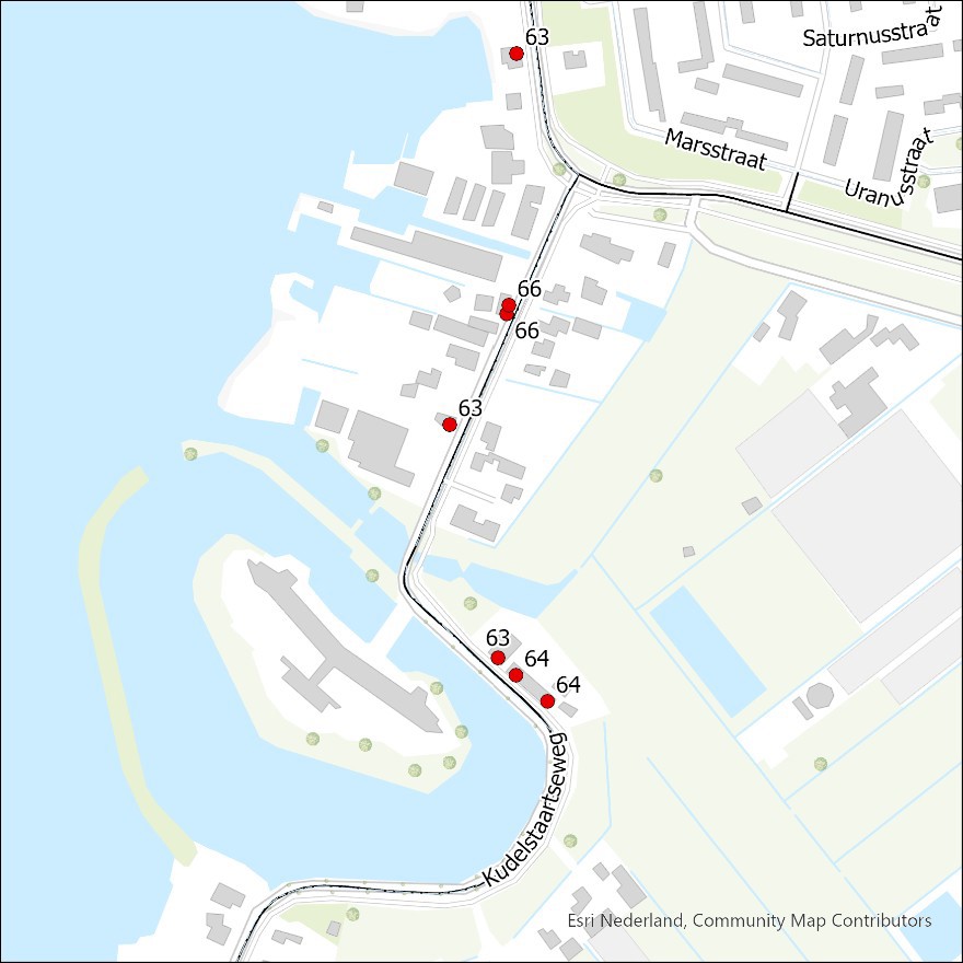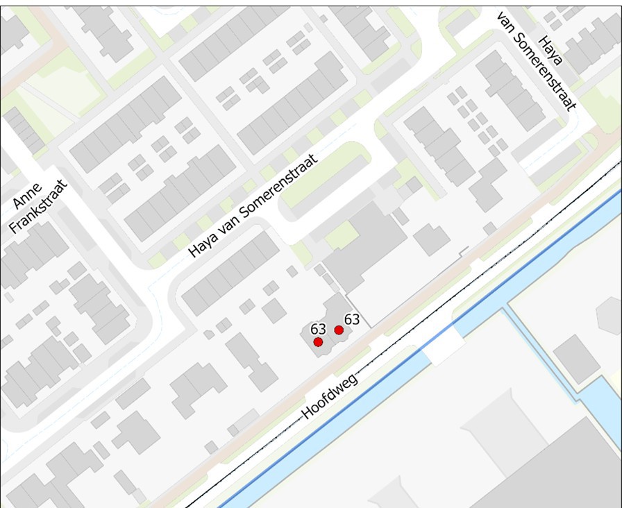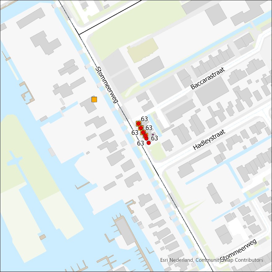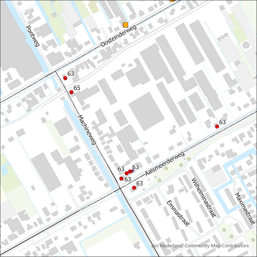 Aan de Machineweg en Aalsmeerderweg liggen 7 adressen met geluid tussen de 63 en 65 dB (Figuur 5 9). Vier adressen liggen ter hoogte van de kruising aan de twee wegen.