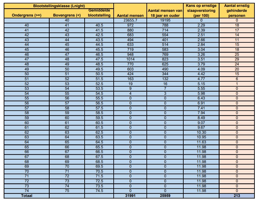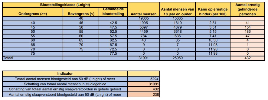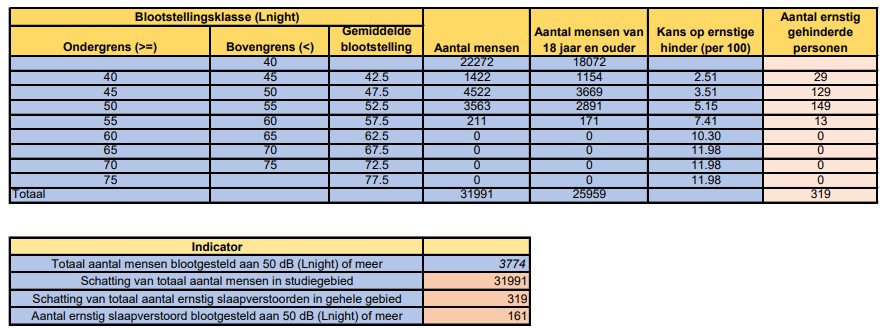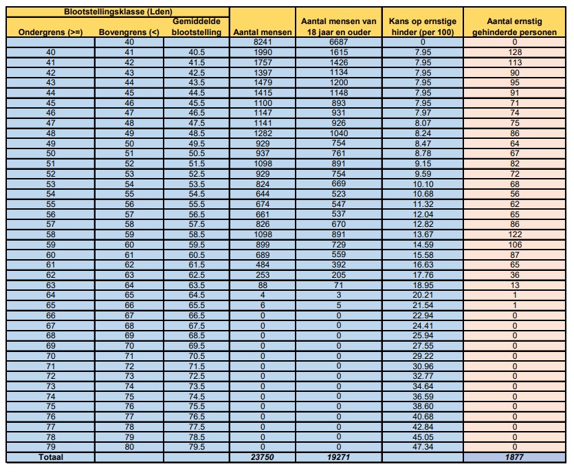 Gekeken naar de aantallen blootgestelden boven de 55dB is er geen sprake van een toename. In 2011 waren dat er 13.300 (zie Tabel BIV-1), in 2021 in totaal 12.307 (zie bijlage III). De toename in (ernstig) gehinderden komt voort uit de nieuw toegepaste methodiek voor bepaling van gehinderden, voornamelijk door het meenemen van de lagere geluidbelastingklassen (<55 dB).