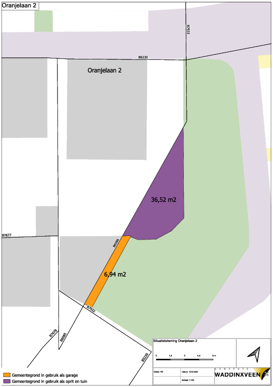 Een (1) perceel grond (snippergroen) grenzend aan de zijkant en achterzijde van het perceel Oranjelaan 2 te Waddinxveen. De afmeting van dit perceel bedraagt 43,46 m2. Dit perceel maakt thans (voor kadastrale uitmeting en splitsing) deel uit van het perceel kadastraal bekend gemeente Waddinxveen sectie B,nummer 7932(ged.).