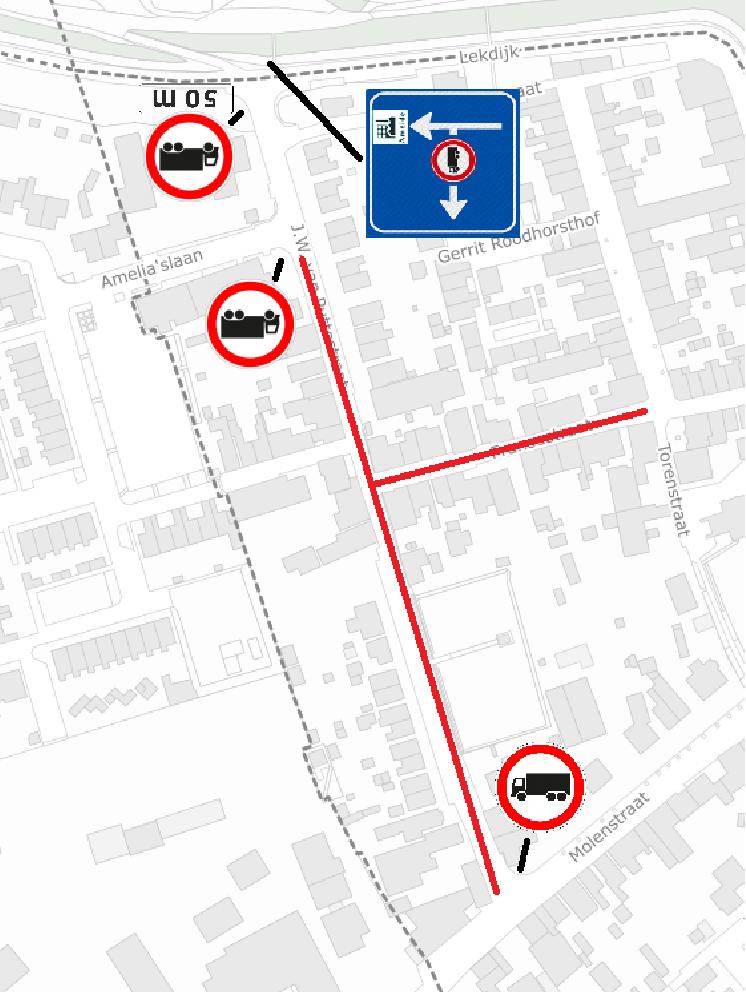 • Het aankondigen van de geslotenverklaring door middel van een informatiebord op de Lekdijk en een C07 bord met onderbord “na 50m” aan het begin van de J.W. van Puttestraat.