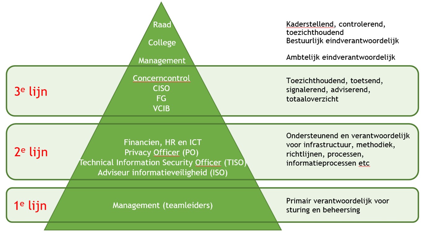 De concerncontroller, de Chief Information Security Officer (CISO) en de Functionaris Gegevensbescherming (FG) hebben een toetsende, signalerend, initiërende en adviserende rol m.b.t. de kwaliteit, de getrouwheid, rechtmatigheid en het functioneren van de 1e en 2e lijn. Onderdeel van de 3e lijn zijn interne en externe audits vanuit de stafteam Concerncontrol, onder andere de Verbijzonderde Interne Controles (VIC) en onderzoeken/audits op basis van art. 213a van de Gemeentewet, art. 33 van de Wet Politiegegevens en de diverse audits vanuit ENSIA (Eenduidige Normatiek Single Information Audit). De 3e lijn resulteert in de evaluatie van de opzet, bestaan en werking van de 1e en de 2e verdedigingslinie als basis voor de evaluatie/beoordeling door het management, college en raad.