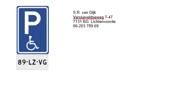 Een gehandicaptenparkeerplaats op kenteken aan te wijzen aan de Klinkepad in Lichtenvoorde, door het plaatsen van bord E-06 als genoemd in Bijlage 1 van het Reglement Verkeersregels en Verkeerstekens 1990, met een kentekenvermelding 89-LZ-VG, op een onderbord.