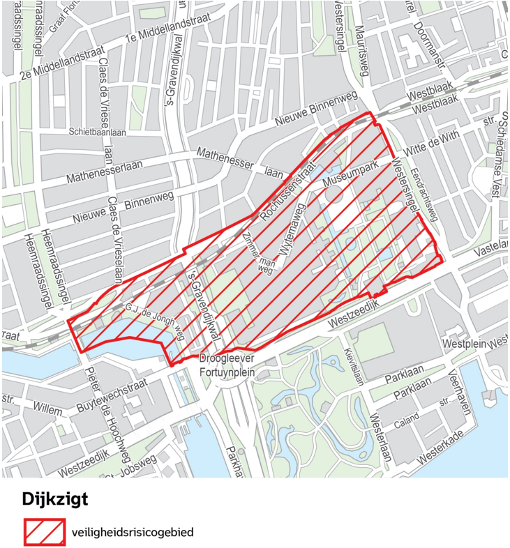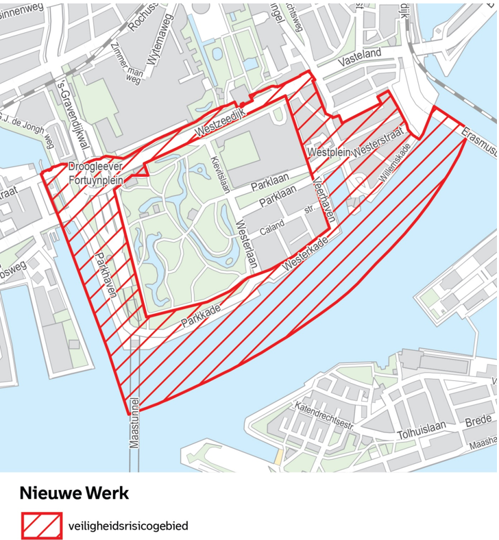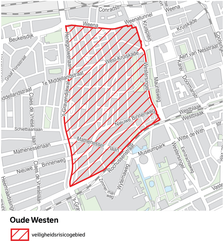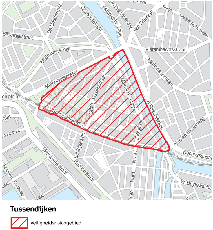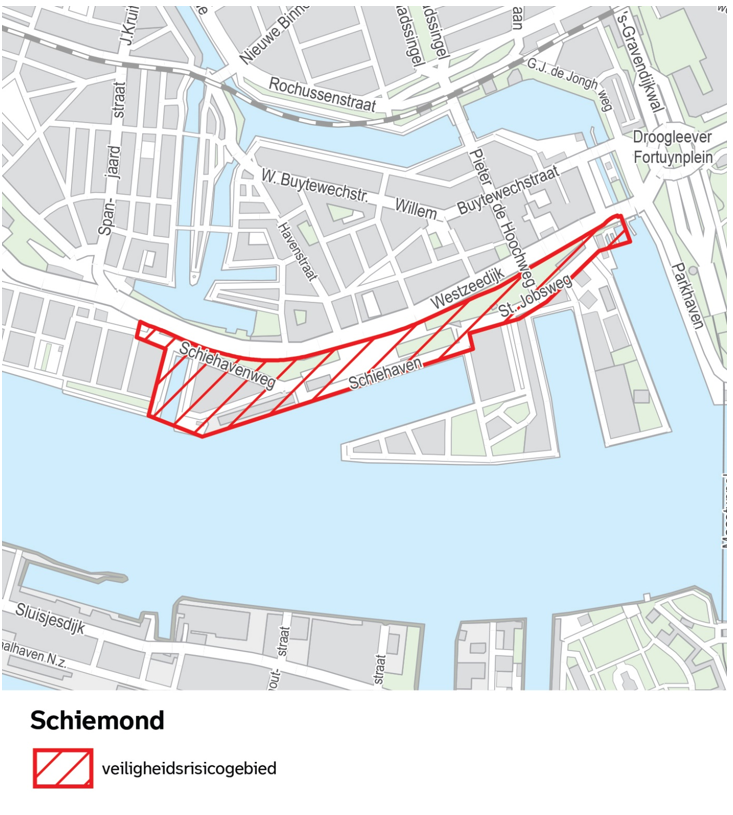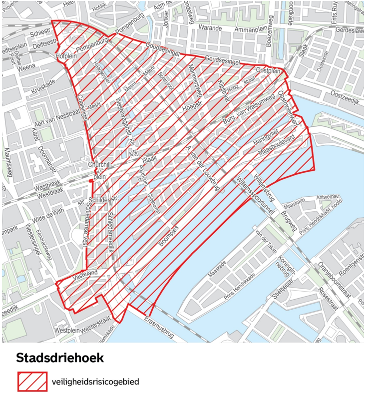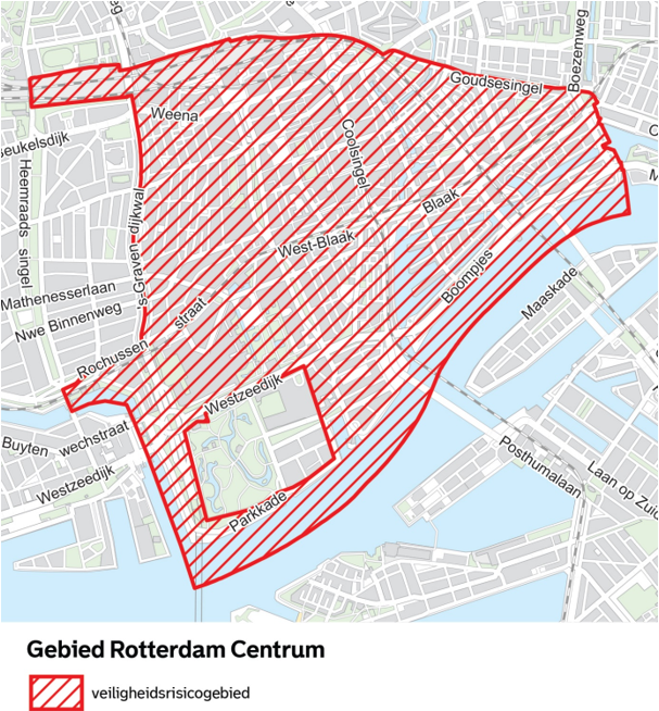 Op grond van artikel 2:76 van de Algemene plaatselijke verordening Rotterdam 2012 wordt het gebied Centrum, zoals aangegeven op de kaarten in bijlage 1, met inbegrip van de daarin gelegen voor het publiek openstaande gebouwen en daarbij behorende erven, wegen, oevers en aanwezige knooppunten van het openbaar vervoer, aangewezen als veiligheidsrisicogebied.