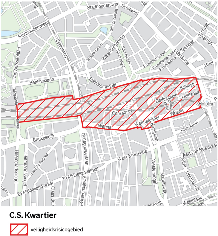 Het veiligheidsrisicogebied Centrum, zoals aangegeven op de kaarten in bijlage 1, omvat de CBS wijken Oude Westen, Cool, Dijkzigt, Nieuwe Werk (uitgezonderd het gebied Het Park en het gebied binnen de straten Baden Powellaan, Heuvellaan,Westerkade, Veerhaven, Westmaaslaan, Westzeedijk tot aan de Baden Powellaan), Stadsdriehoek en C.S.-Kwartier, begrensd door de Parkhaven (water) en de straten ’s-Gravendijkwal, Henegouwerlaan, Weena, Conradstraat, Centraal Station Rotterdam, Delftseplein, Schiestraat, Schiekade, Couwenburg, Pompenburg, Goudsesingel, Oostplein, Oosterkade, Nieuwe Maas (water) en Parkhaven (water), de genoemde wegen, alle OV-knooppunten en locaties daaronder begrepen;