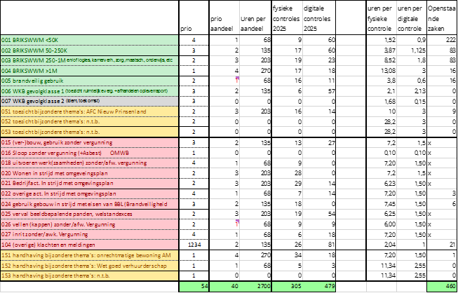 De cijfers voor toezicht van voorgaande jaren zijn bekend. Deze cijfers zullen als richtlijn dienen voor het jaar 2025. De tijd die aan elk handhavingsonderdeel wordt toegewezen, is afhankelijk van de prioriteit van dat onderdeel. De inzet van middelen en capaciteit wordt bepaald op basis van deze prioritering. Er zijn echter enkele uitzonderingen, waarbij een aantal onderdelen belangrijk gevonden worden, maar waar echter onvoldoende werkvoorraad beschikbaar is om deze volledig te kunnen vullen.
