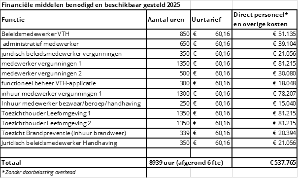 In onderstaande tabel zijn de uren van de medewerkers van team VTH opgenomen, alsmede het uurtarief en de kosten. Deze kosten zijn opgenomen in de begroting 2025.