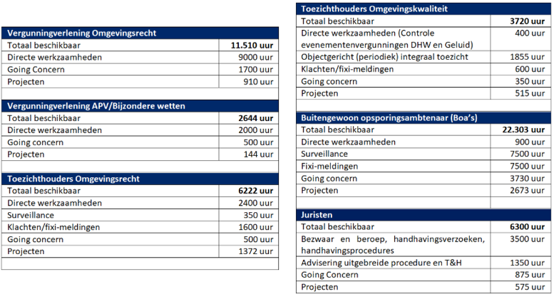 In het VTH-beleidsplan is een methodiek geïntroduceerd om meer grip te krijgen op de capaciteit, waarbij wordt uitgegaan van het totaal aan beschikbare uren. Om meer inzicht te krijgen in deze uren hebben we de medewerkers onderverdeeld in 6 functiegroepen. Per functiegroep hebben we bepaald hoeveel uren inzet zij in totaal kunnen plegen op jaarbasis. Deze beschikbare uren zijn onderverdeeld in categorieën werkzaamheden; directe werkzaamheden, going concern, klachten/fixi-meldingen, projecten en objectgericht toezicht en surveillance.