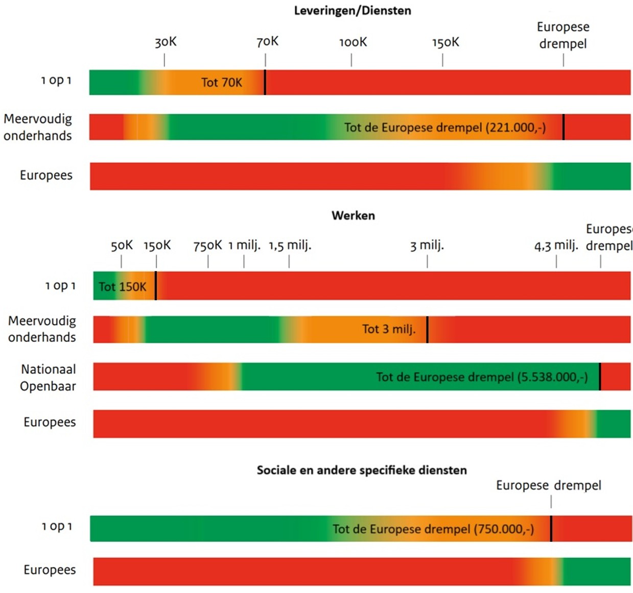 De gemeente Baarn besteedt een opdracht Europees aan als de waarde hoger is dan het betreffende drempelbedrag1. Onder die drempelbedragen wordt per opdracht bepaald welke procedure het meest geschikt is. Hierbij neemt de gemeente het balkenschema hiernaast uit de Gids Proportionaliteit2 als leidraad. Het balkenschema geeft met kleuren aan welke aanbestedingsprocedure in welk geval proportioneel is. Om doelmatig in te kopen, neemt de gemeente de maximale ruimte (de groene én oranje balken) die de Gids Proportionaliteit biedt.