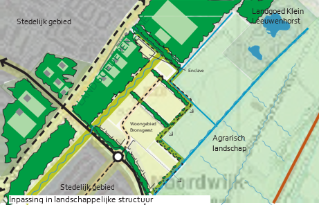 Het stedenbouwkundig plan voor Bronsgeest is ontworpen binnen de grenzen van het bestemmingsplan Bronsgeest 2021 met bestemming Wonen - Nader uit te werken. Het uit te geven gebied bevindt zich in 1 klein gebied (de enclave) in het noordwesten en een groot gebied. Ten oosten van het parkeerterrein van Achmea en de grote kavels met tuinen aan de Gooweg is in het bestemmingsplan een ecologische zone opgenomen. De hieraan grenzende parkzone vormt een overgang tussen de ecologische zone en het woongebied. De vastgestelde beleidsuitgangspunten, zoals opgenomen in de nota van uitgangspunten en de Regels uit het bestemmingsplan, hebben geleid tot een compact bebouwd woongebied. De ecologische ambities krijgen daardoor gestalte in de randen van het woongebied en de enclave en in de groenzone, die door het woongebied loopt. Die randen worden verschillend uitgewerkt.