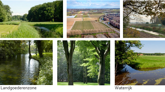De groen-blauwe slagen van het agrarisch gebied, haaks op de landgoederenzone bepalen de ruimtelijke hoofdstructuur.