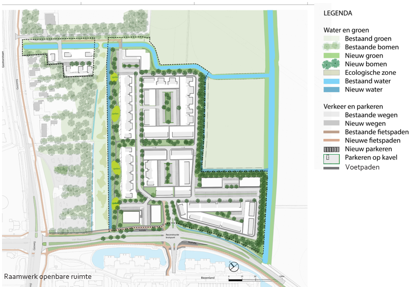 Deze worden natuurlijk ingericht met veel groen en bomen. De zone tussen de achtertuinen van percelen aan de Gooweg en het plangebied maakt onderdeel uit van het Netwerk Natuur Nederland (NNN) en wordt ecologisch ingericht.