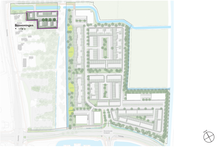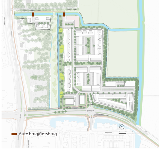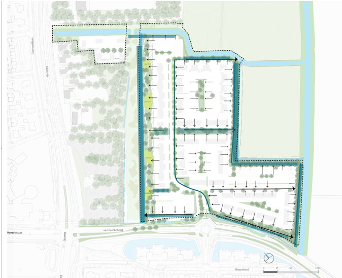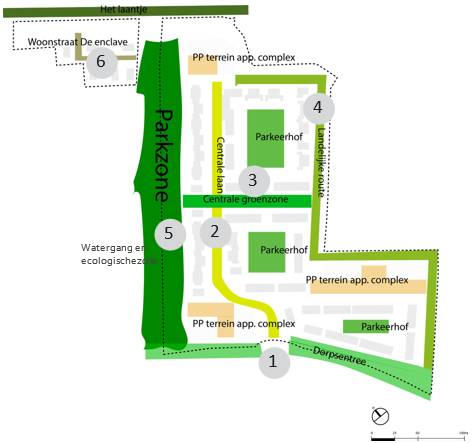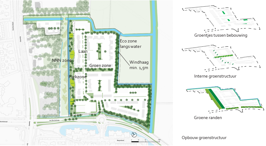 Dit heeft ertoe geleid dat het meeste groen in de randen van het woongebied komt, zoals de parkzone, de sloten aan de noord- en oostzijde en de groenzone langs de van Berckelweg. Daarnaast is er voor gekozen om- haaks op de parkzone - een groene zone met bomen door het woongebied te leggen. Het overige groen binnen het woongebied is gekoppeld met de verkeersruimten, zoals langs de centrale laan, de parkeerhoven en waar mogelijk langs de woonstraatjes.