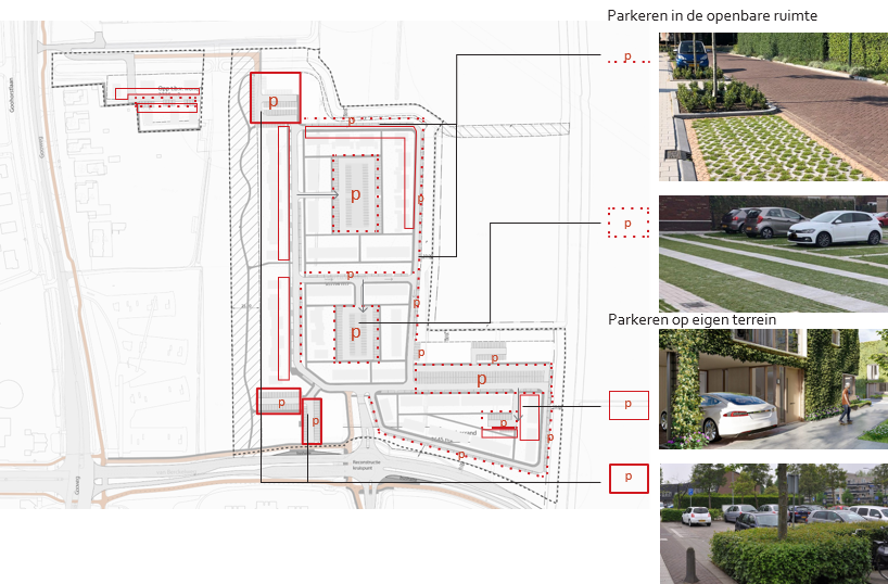 Het parkeren vindt zoveel mogelijk plaats achter de bebouwing, in de binnenhoven, om de dominantie van auto’s in het straatbeeld wat te beperken. De parkeerterreinen bij de appartementencomplexen zijn zo georganiseerd dat deze beperkt zichtbaar zijn vanaf de entree en centrale laan. Deze parkeerterreinen liggen bij het complex aan het eind van de centrale laan, bij de twee wooncomplexen in het zuidoost cluster en bij de twee wooncomplexen bij de entree aan de Van Berckelweg.