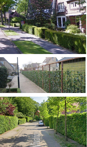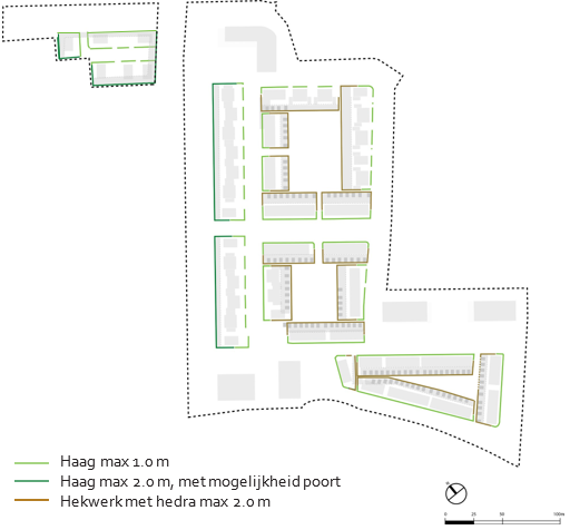 Vanwege die zichtbaarheid worden hagen of hekwerken met hedra (rond de parkeerhoven) aangeplant die onderdeel zijn van het groene lommerrijke uitstraling van de wijk. Gedacht wordt aan beuk- hagen (Fagus sylvatica) vanwege het statige karakter, en die bladbehoudend is in de winter en beschikt over veerkrachtige takken. Deze haag met een zone van 0,6 meter breed en een hoogte van 1 meter komt op particulier terrein te staan. Waar zijtuinen grenzen aan voortuinen, trottoirs en stegen worden overgangshagen geplaatst, zodat geen zicht is op ander soort erfafscheidingen. Waar zijtuinen overgaan in achtertuinen is het toegestaan dat de hagen hoog zijn in verband met de gewenste privacy. Het is niet gewenst langs zij- en achtertuinen grenzend aan trottoirs hoge schuttingen, tuinmuren en dergelijke bouwwerken achter de hagen te plaatsen in verband met de groene uitstraling van de wijk.