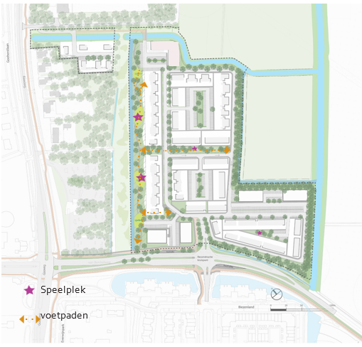 In de woonwijk zijn kinderspeel- plekken in de leeftijdscategorie 0-6 jaar en 6-12 jaar. De speelaanleidingen zijn allen passend bij het dorpse karakter, waarbij het de voorkeur betreft om geen standaard speeltoestellen toe te passen máár (indirecte) speelaanleidingen.