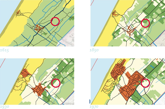 Het patroon van strandwallen en –vlaktes is sterk bepalend. Op de strandwallen en oude duinen die min of meer vervlakt in het landschap liggen vestigden zich mensen. Dorpen, landgoederen en boerderijen kregen op de flanken een plek. De strandvlakten daarentegen bleven veelal onbebouwd en zijn na ontginning in gebruik genomen als weidegronden en worden gekenmerkt door een open en weids karakter. Noordwijk is op de meest westelijk gelegen strandwal gebouwd.